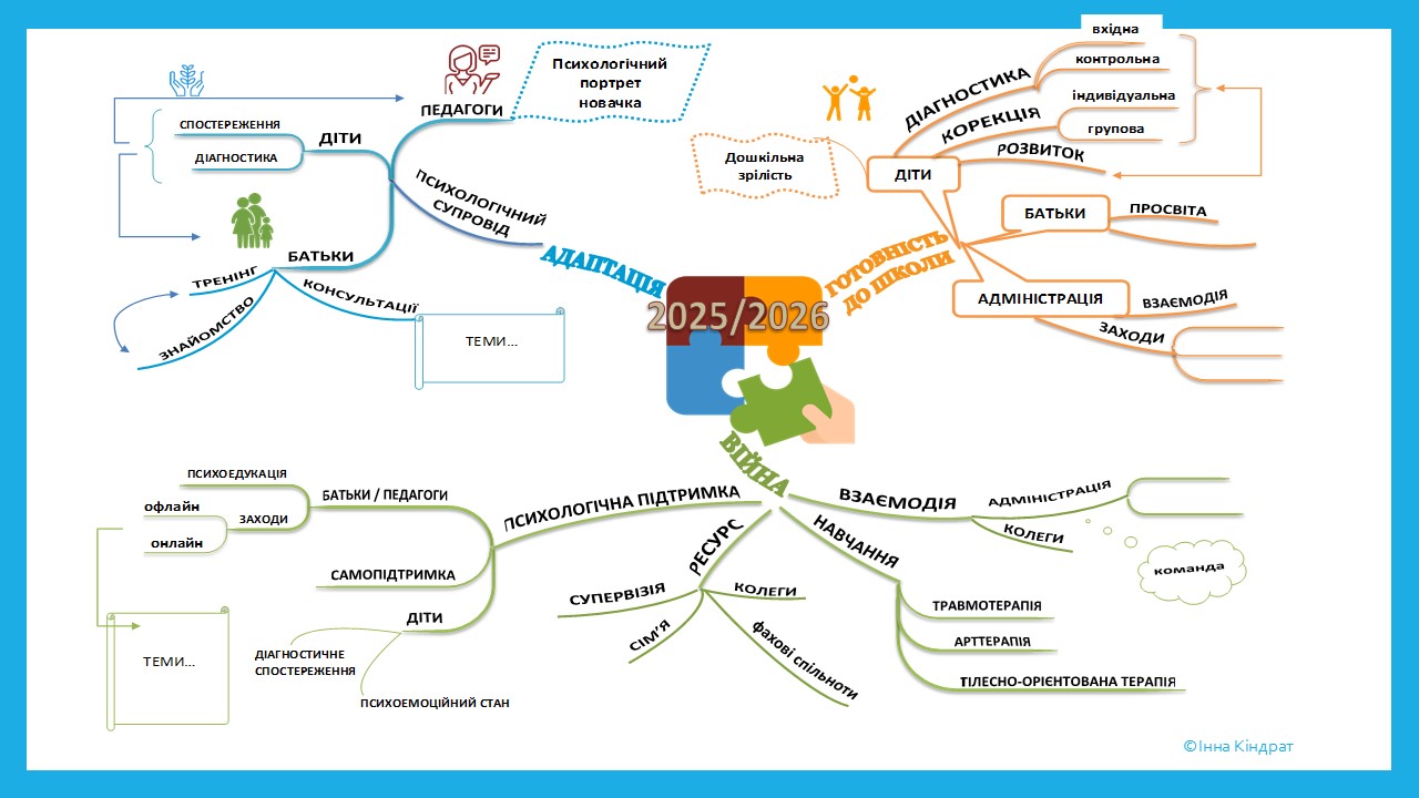 Ось приклад річного плану практичного психолога ЗДО у вигляді інтелект-карти від Інни Кіндрат.