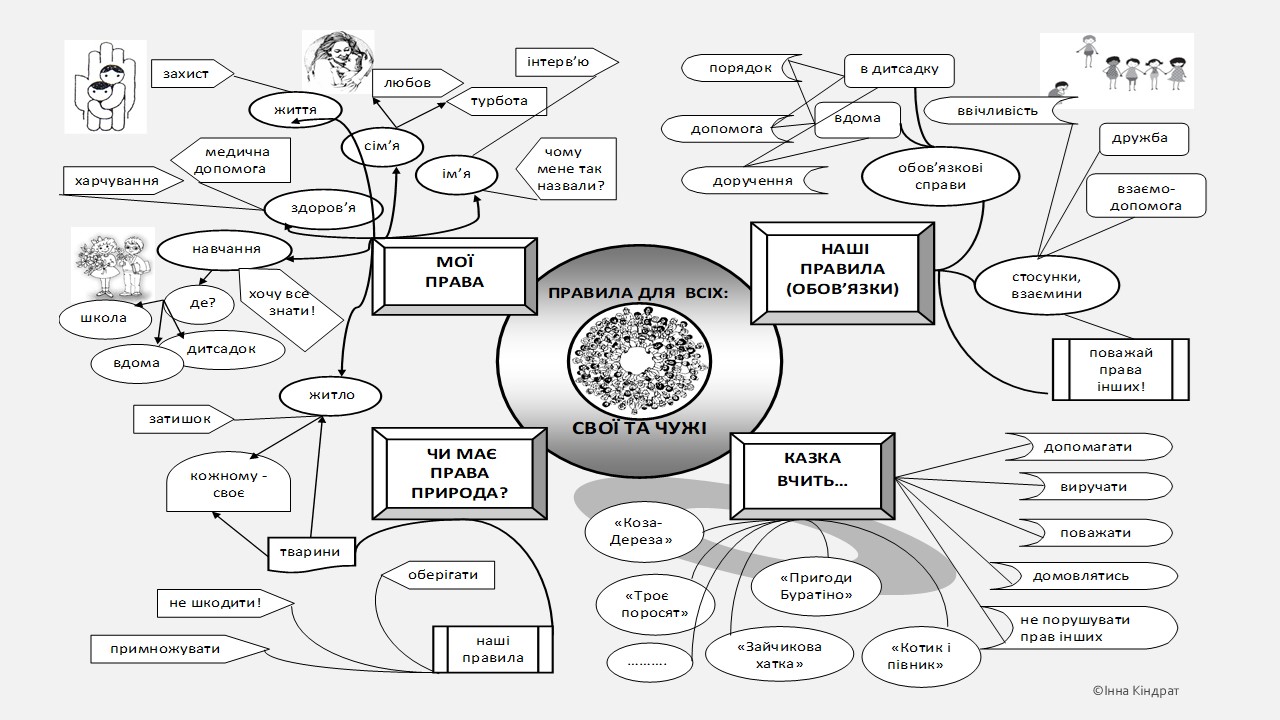 Найближчий для дітей літературний жанр – казка – активно використовується у ході обговорень з дітьми правил співжиття та стосунків, питань дотримання прав інших. Цікавими є проблемні питання на зразок «А чи має права природа?» або, наприклад, «Які права має світ речей?» Так через інтеграцію змісту освіти стає можливим розуміння того, що все у світі взаємопов’язано, що кожен з нас відповідальний за те, що відбувається поряд.